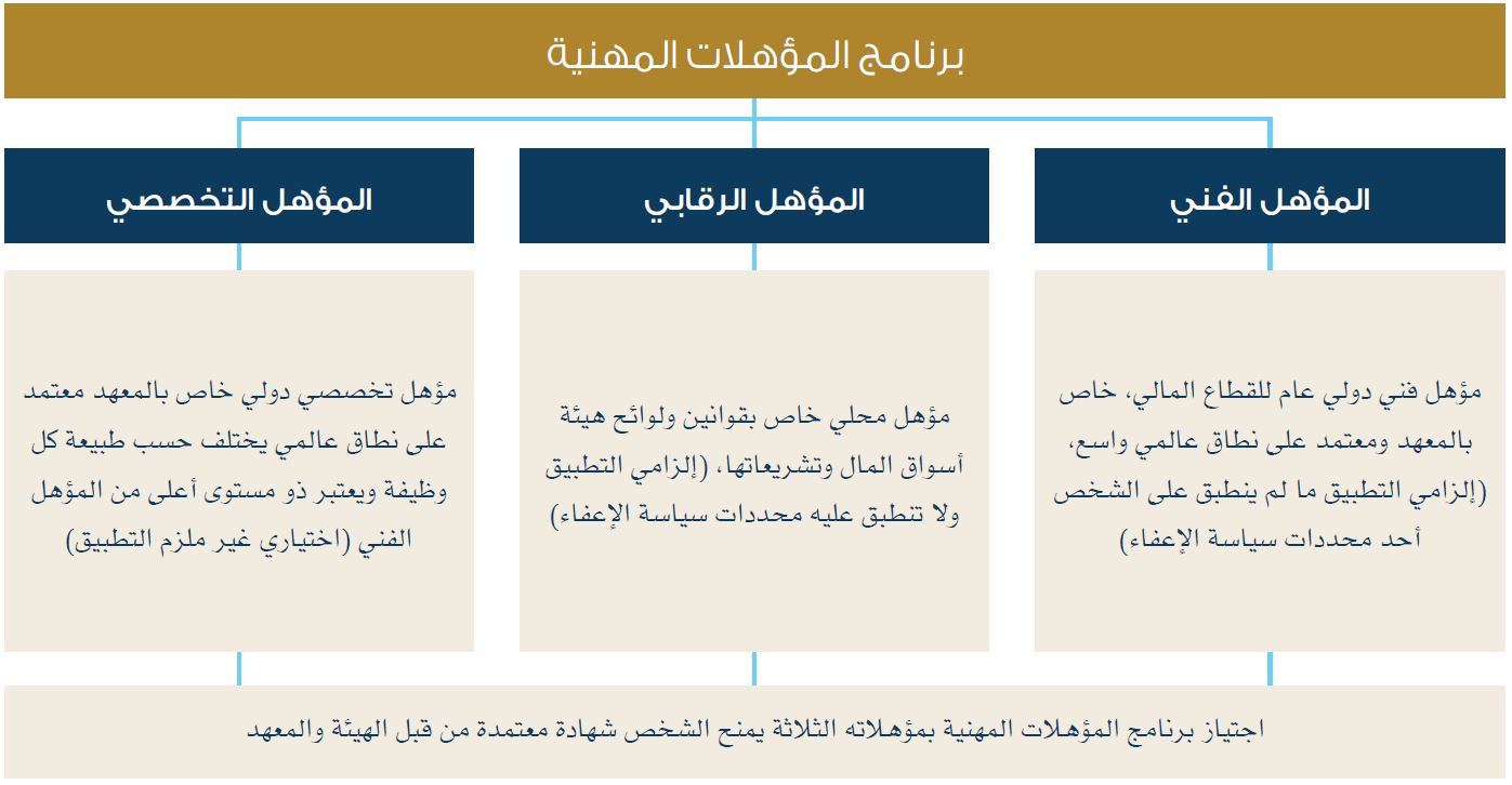 يتكون برنامج المؤهلات المهنية من ثلاثة مؤهلات مختلفة تختص جميعها في القطاع المالي، حيث يتم الحصول على المؤهل عند اجتياز الاختبارات التأهيلية الخاصة بكل مؤهل بنجاح، وتختلف المؤهلات فيما بينها بمدى إلزامية تطبيقها وفق الآتي: