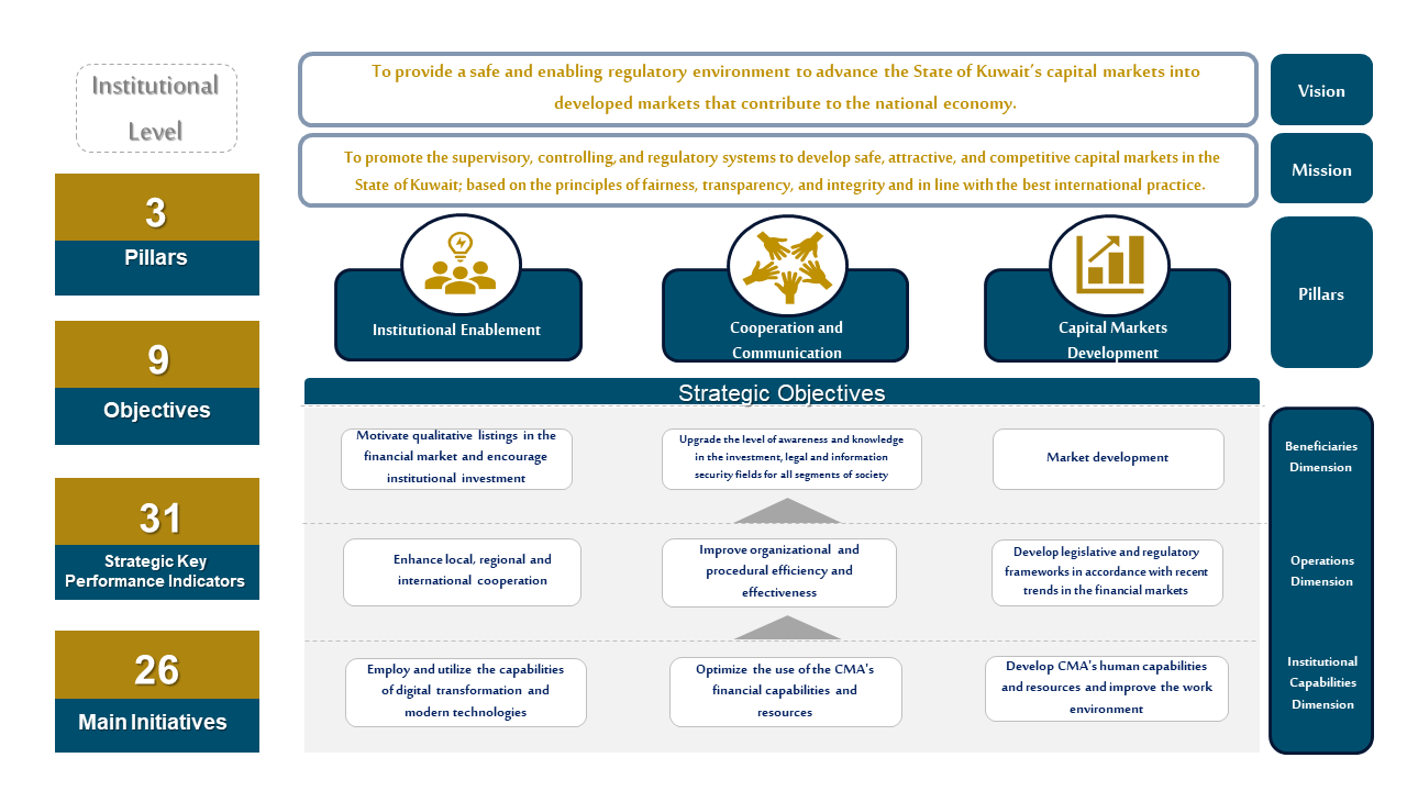 CMA's third strategic plan is based on three main pillars, including a number of strategic objectives, through which efforts are intensified and focused to achieve the objectives of the plan. They are measured by a number of strategic indicators. From Each objective is divided into major initiatives, which I turn has a number of sub-initiatives to achieve the plan’s vision of providing a safe and enabling regulatory environment for the development of capital markets in the State of Kuwait into developed markets that contribute to the national economy. The drawing below shows the components of the CMA’s strategic plan: